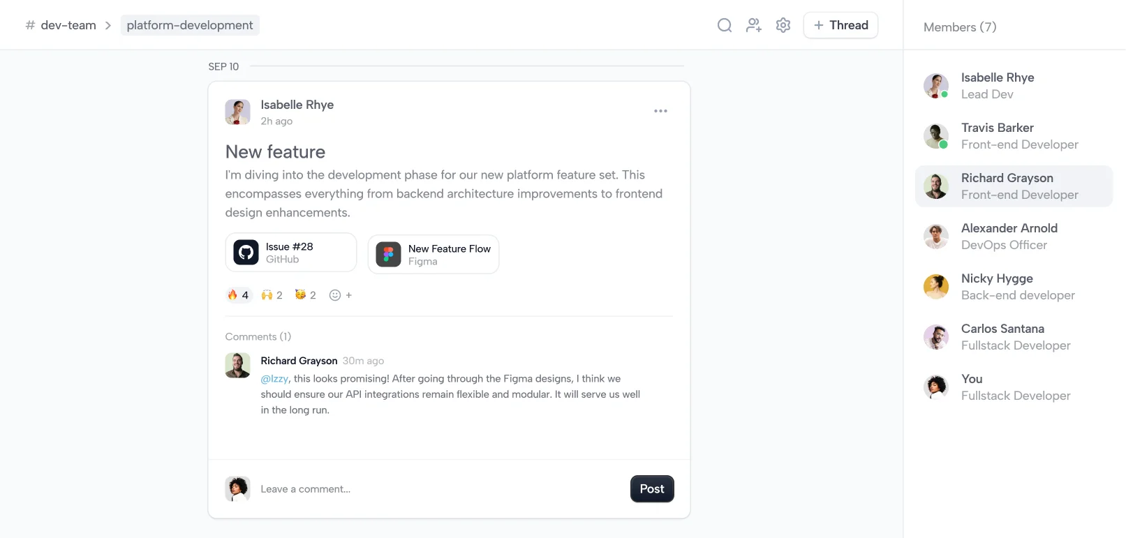 @Isabelle initiated the development of a new feature set, providing both a GitHub issue and a Figma design for reference. @Richard emphasized the importance of modular API integrations, while @Travis proposed introducing a caching mechanism. @Carlos supported both ideas and suggested collaboration between @Travis and Alex. Sasha stressed the importance of continuous documentation.